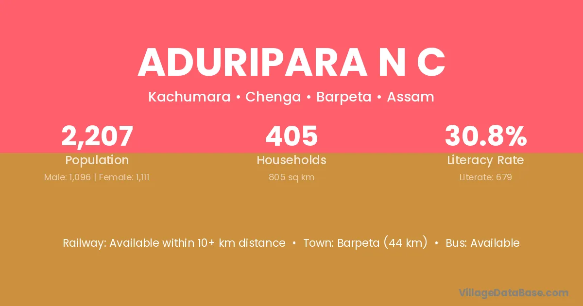 Barpeta (44 km) is the nearest town to Aduripara N C village for major economic activities and is located approximately 44 km away.