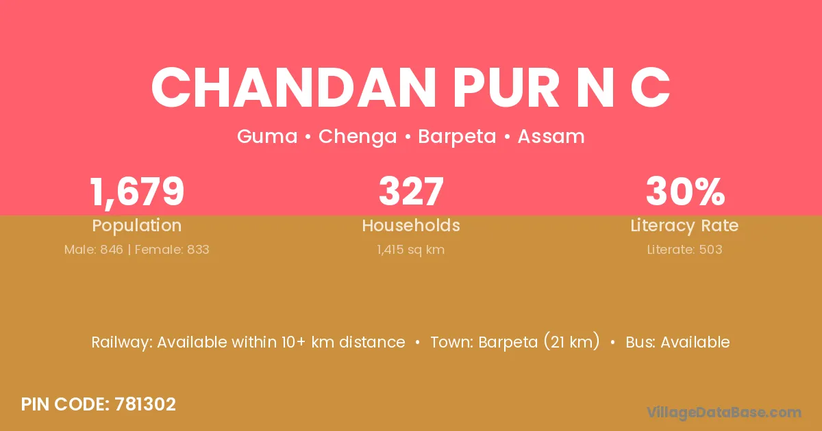 Barpeta (21 km) is the nearest town to Chandan Pur N C village for major economic activities and is located approximately 21 km away.