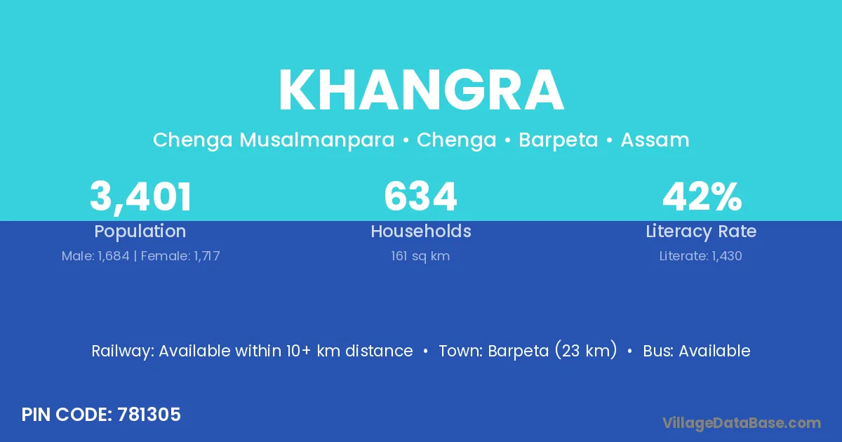 Barpeta (23 km) is the nearest town to Khangra village for major economic activities and is located approximately 23 km away.