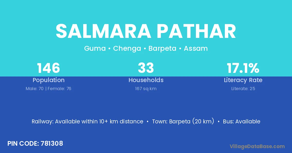 Barpeta (20 km) is the nearest town to Salmara Pathar village for major economic activities and is located approximately 20 km away.