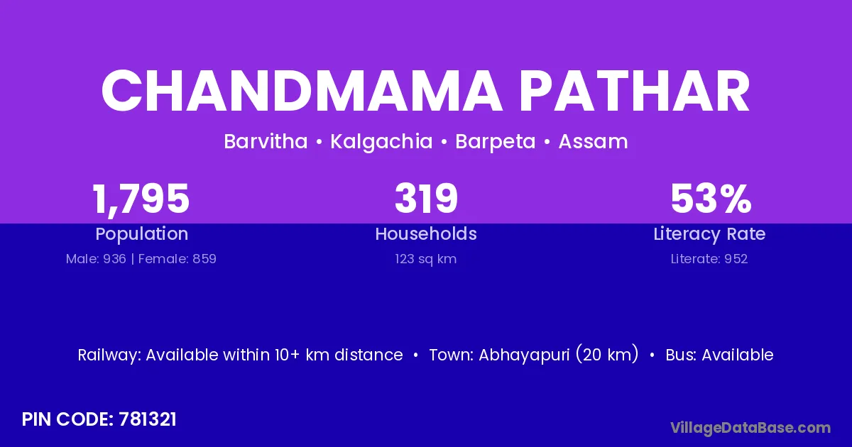 Abhayapuri (20 km) is the nearest town to Chandmama Pathar village for major economic activities and is located approximately 20 km away.