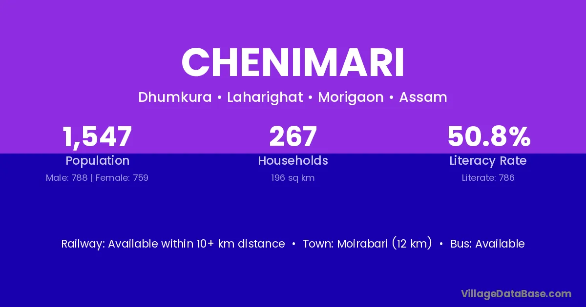 Sorbhog (28 km) is the nearest town to Chenimari village for major economic activities and is located approximately 28 km away.