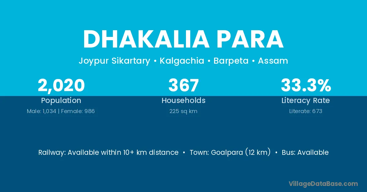 Goalpara (12 km) is the nearest town to Dhakalia Para village for major economic activities and is located approximately 12 km away.