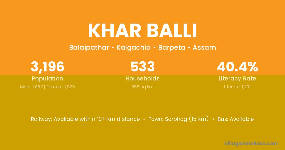 Sorbhog (15 km) is the nearest town to Khar Balli village for major economic activities and is located approximately 15 km away.