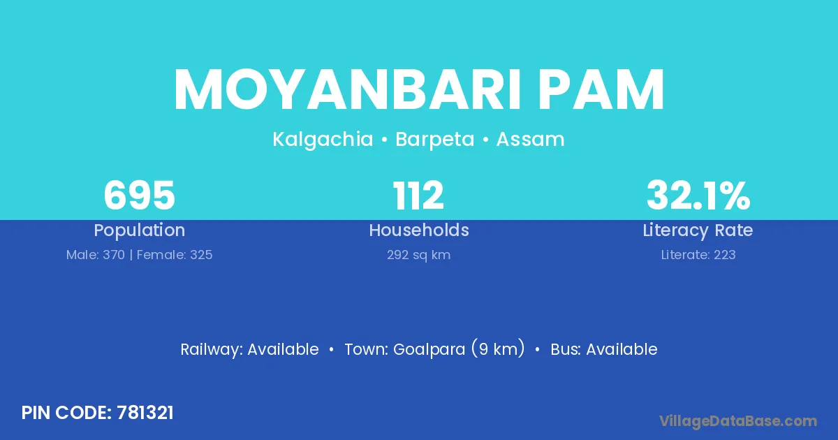 Goalpara (9 km) is the nearest town to Moyanbari Pam village for major economic activities and is located approximately 9 km away.