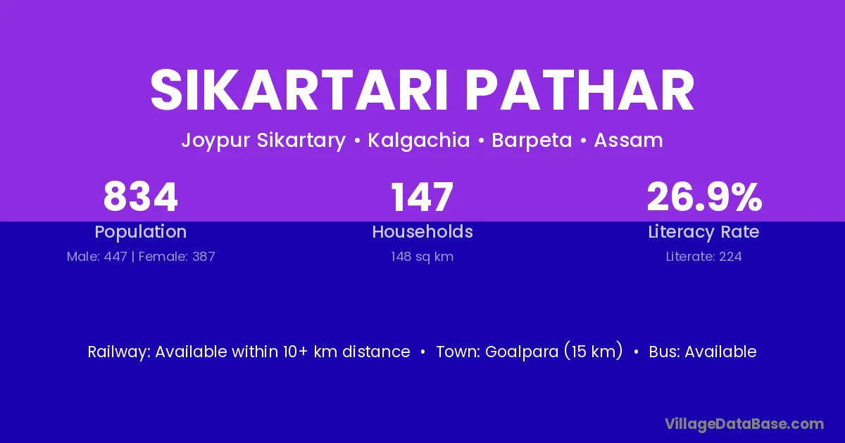 Goalpara (15 km) is the nearest town to Sikartari Pathar village for major economic activities and is located approximately 15 km away.