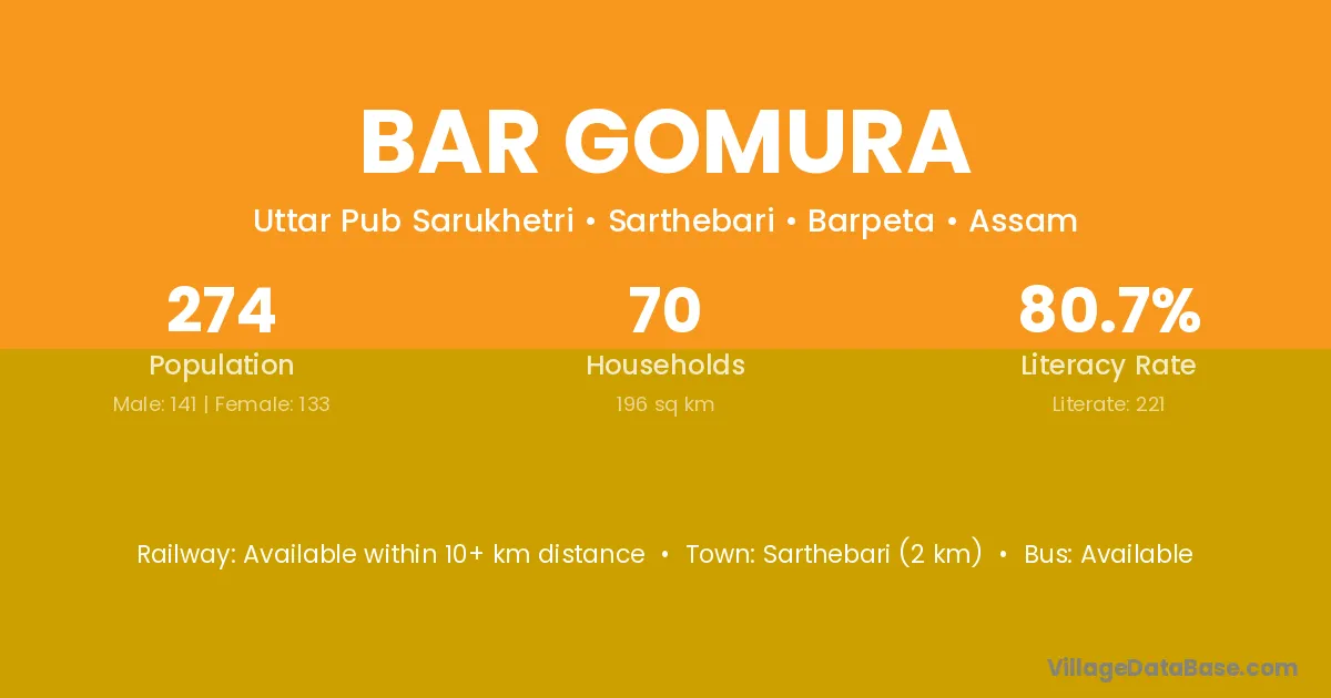 Sarthebari (2 km) is the nearest town to Bar Gomura village for major economic activities and is located approximately 2 km away.