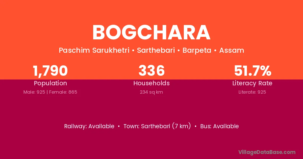 Sarthebari (7 km) is the nearest town to Bogchara village for major economic activities and is located approximately 7 km away.