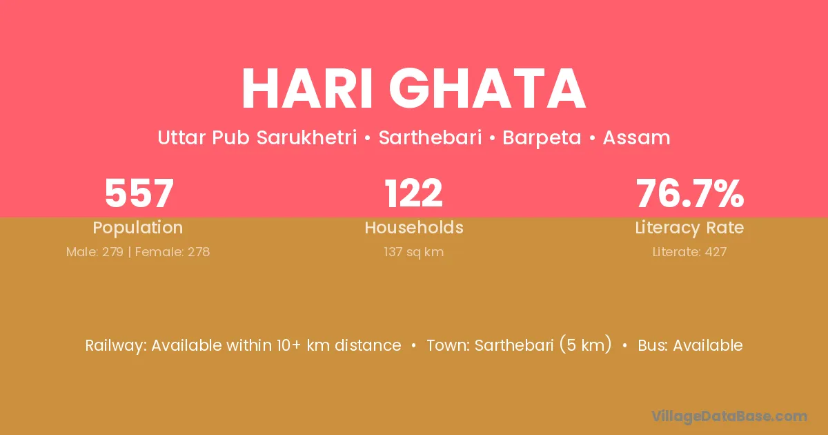 Sarthebari (5 km) is the nearest town to Hari Ghata village for major economic activities and is located approximately 5 km away.