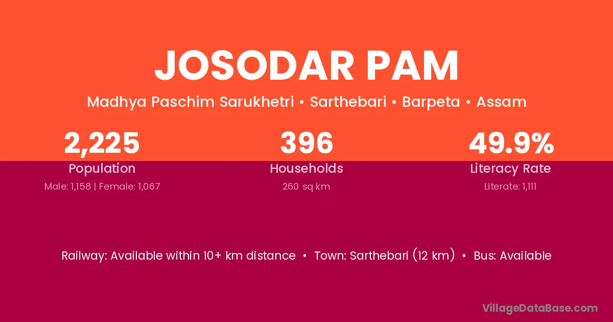 Sarthebari (12 km) is the nearest town to Josodar Pam village for major economic activities and is located approximately 12 km away.