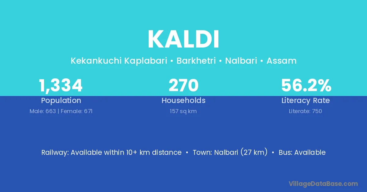 Sarthebari (11 km) is the nearest town to Kaldi village for major economic activities and is located approximately 11 km away.