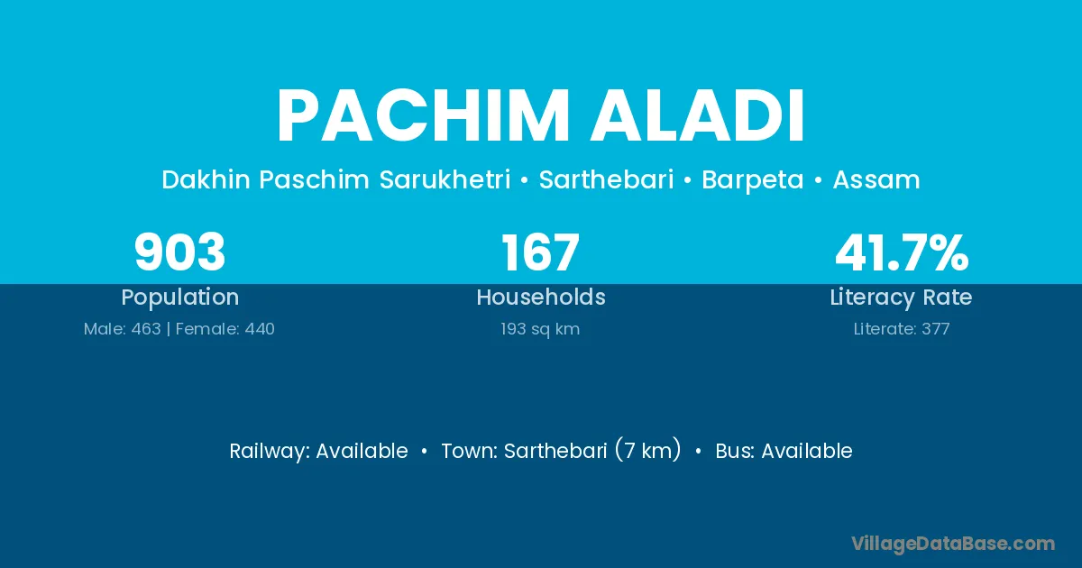 Sarthebari (7 km) is the nearest town to Pachim Aladi village for major economic activities and is located approximately 7 km away.