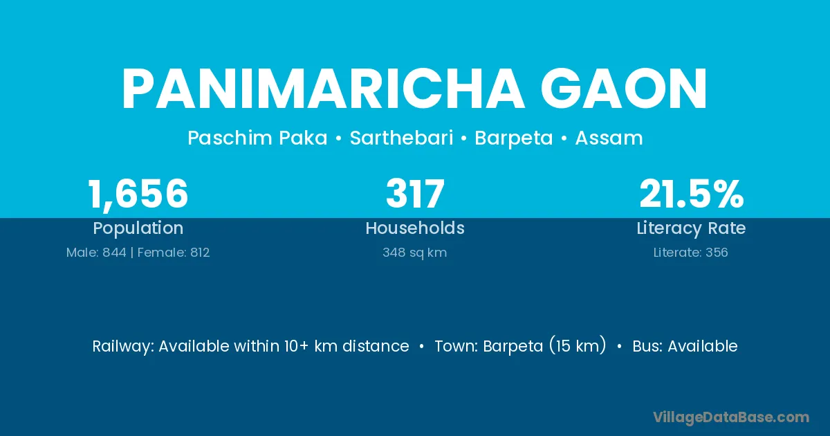 Barpeta (15 km) is the nearest town to Panimaricha Gaon village for major economic activities and is located approximately 15 km away.