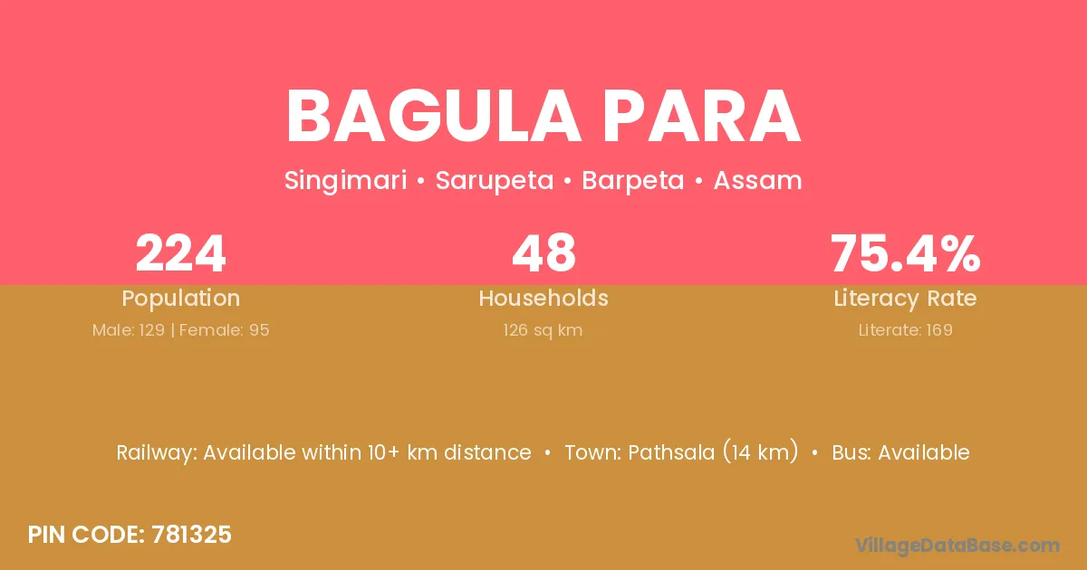 Pathsala (14 km) is the nearest town to Bagula Para village for major economic activities and is located approximately 14 km away.