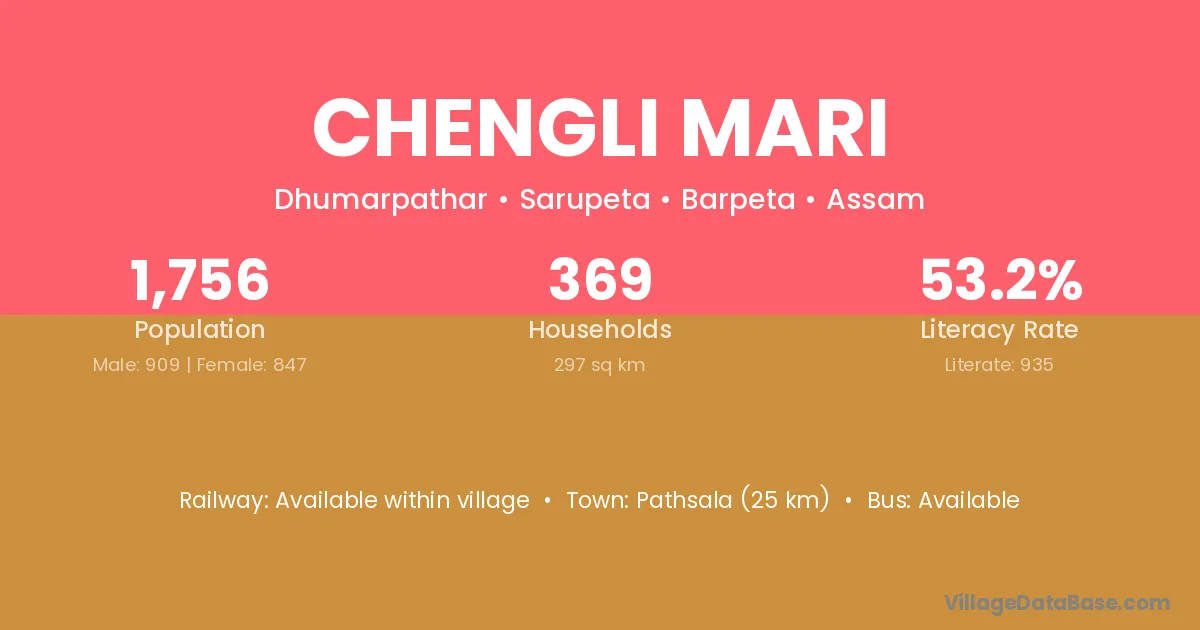 Pathsala (25 km) is the nearest town to Chengli Mari village for major economic activities and is located approximately 25 km away.