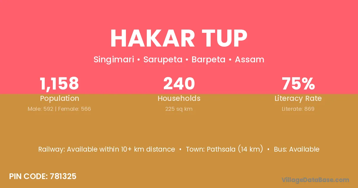 Pathsala (14 km) is the nearest town to Hakar Tup village for major economic activities and is located approximately 14 km away.