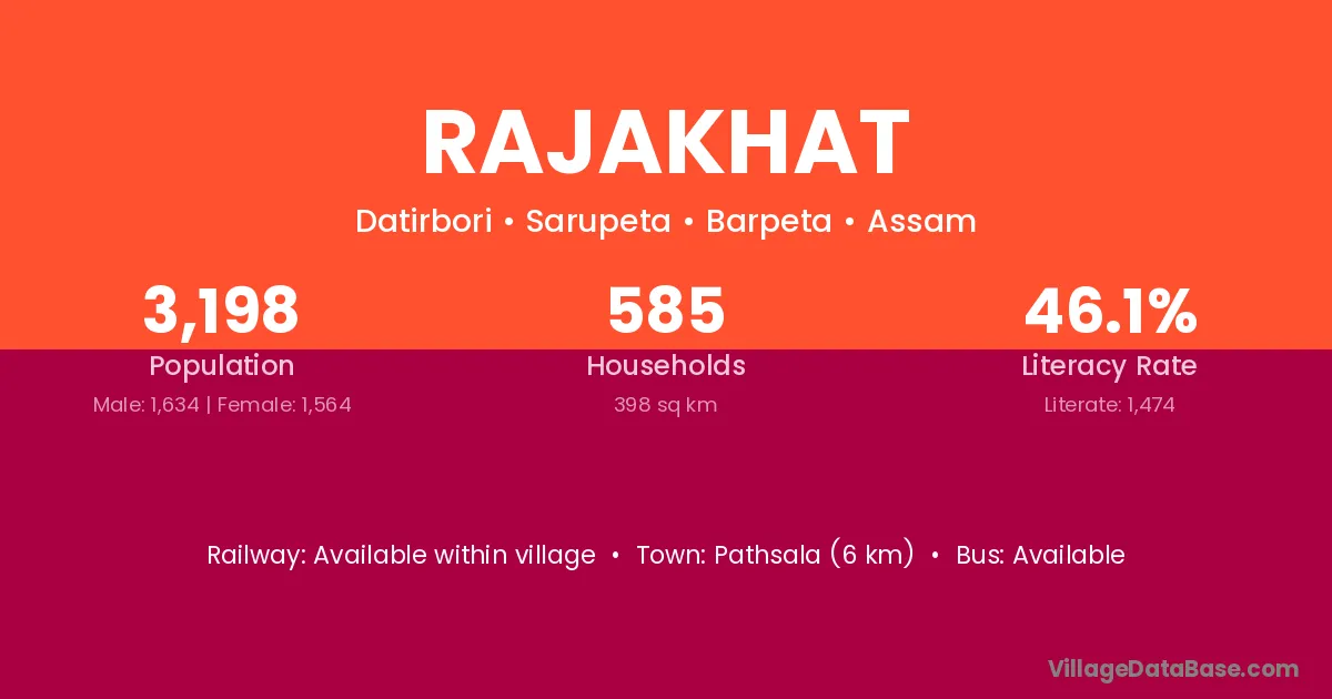 Rajakhat village has a total population of 3,198 people, of which 1,634 are males and 1,564 are females.