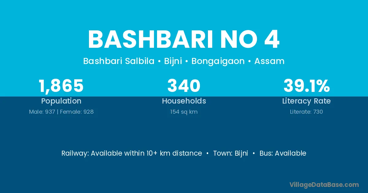 Bashbari No 4 village has a total population of 1,865 people, of which 937 are males and 928 are females.