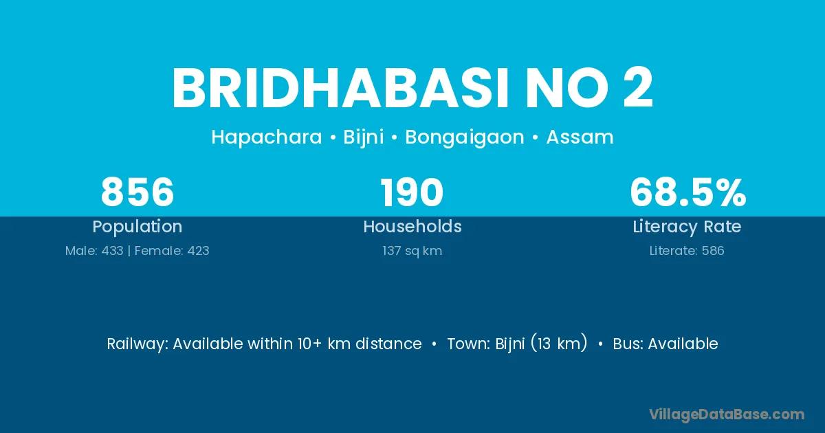 Bijni (13 km) is the nearest town to Bridhabasi No 2 village for major economic activities and is located approximately 13 km away.
