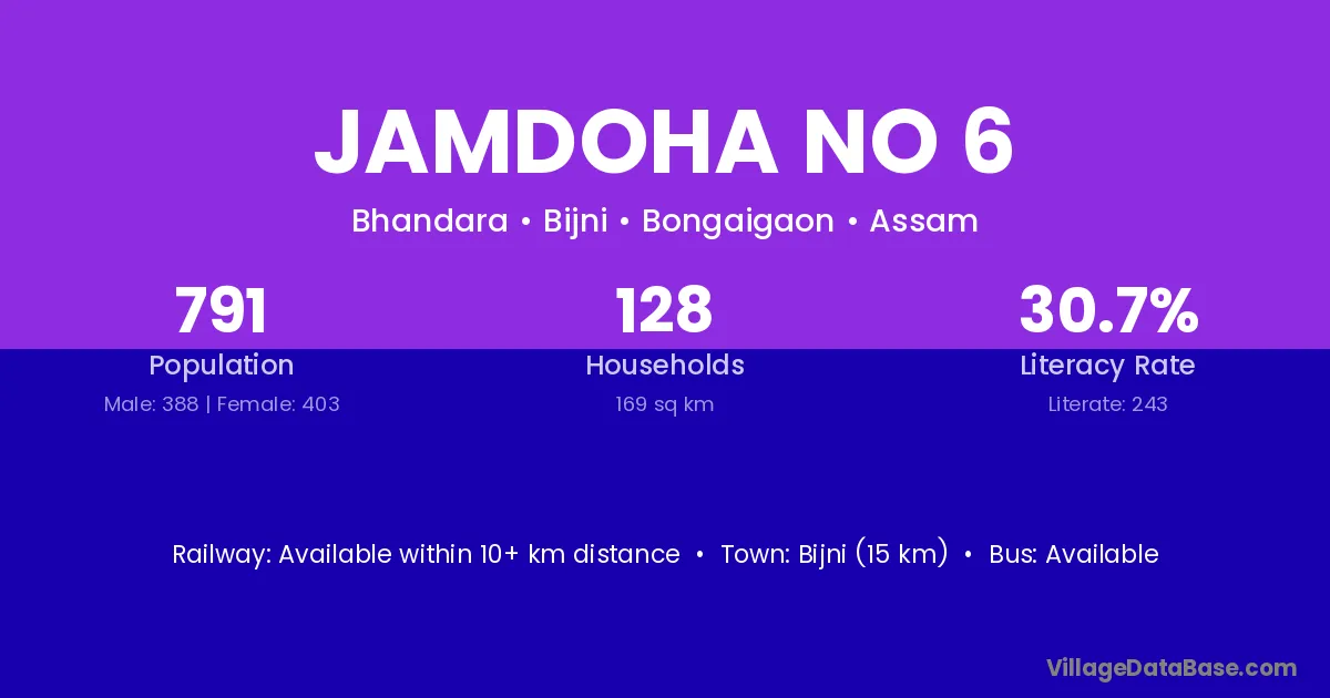 Bijni (15 km) is the nearest town to Jamdoha No 6 village for major economic activities and is located approximately 15 km away.