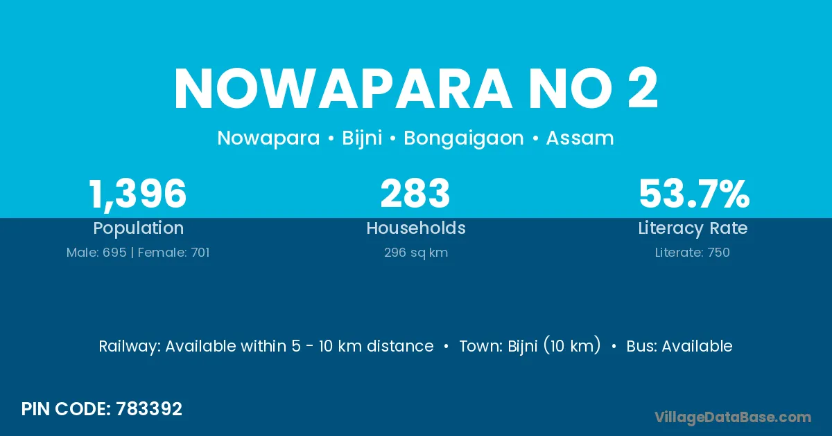 Bijni (10 km) is the nearest town to Nowapara No 2 village for major economic activities and is located approximately 10 km away.