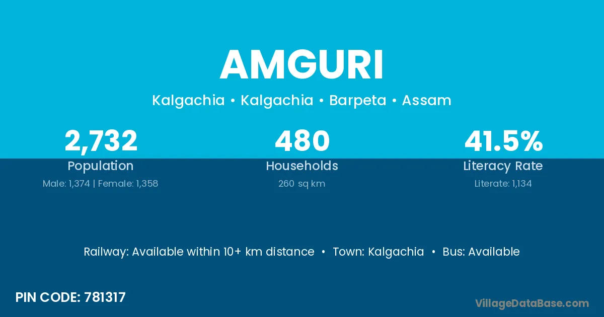 Bongaigaon (15 km) is the nearest town to Amguri village for major economic activities and is located approximately 15 km away.