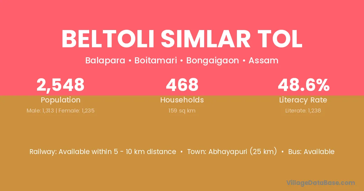 Abhayapuri (25 km) is the nearest town to Beltoli Simlar Tol village for major economic activities and is located approximately 25 km away.