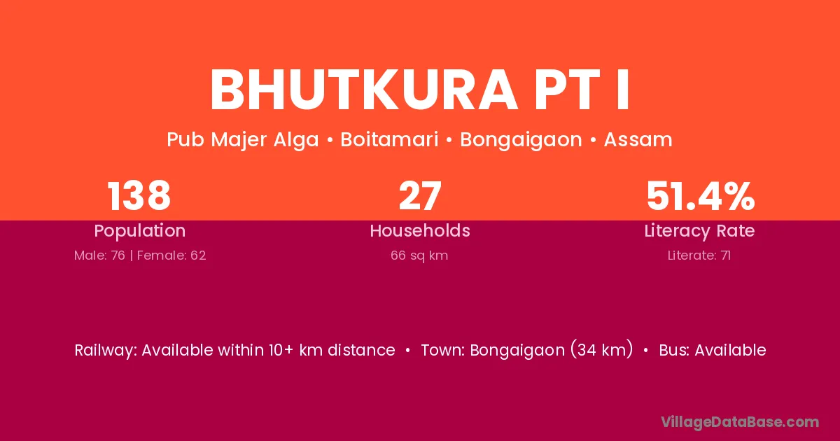 Bongaigaon (34 km) is the nearest town to Bhutkura Pt I village for major economic activities and is located approximately 34 km away.