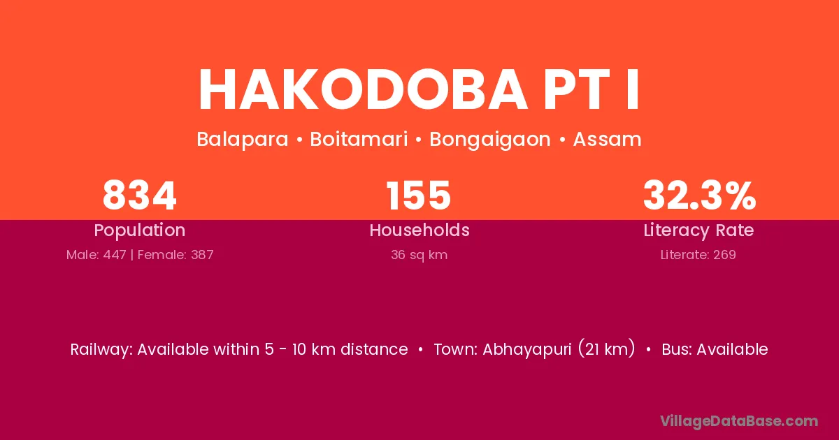 Abhayapuri (21 km) is the nearest town to Hakodoba Pt I village for major economic activities and is located approximately 21 km away.
