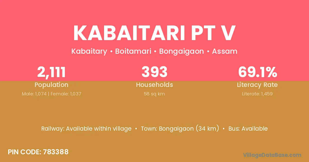 Bongaigaon (34 km) is the nearest town to Kabaitari Pt V village for major economic activities and is located approximately 34 km away.