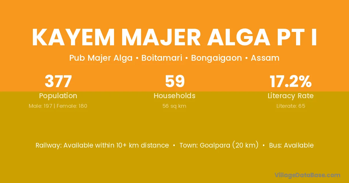 Goalpara (20 km) is the nearest town to Kayem Majer Alga Pt I village for major economic activities and is located approximately 20 km away.