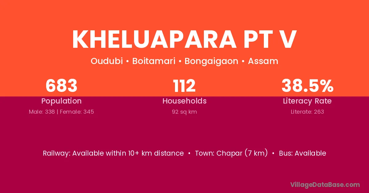 Chapar (7 km) is the nearest town to Kheluapara Pt V village for major economic activities and is located approximately 7 km away.