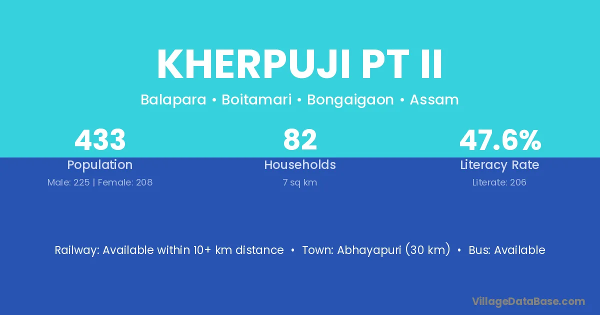 Abhayapuri (30 km) is the nearest town to Kherpuji Pt Ii village for major economic activities and is located approximately 30 km away.