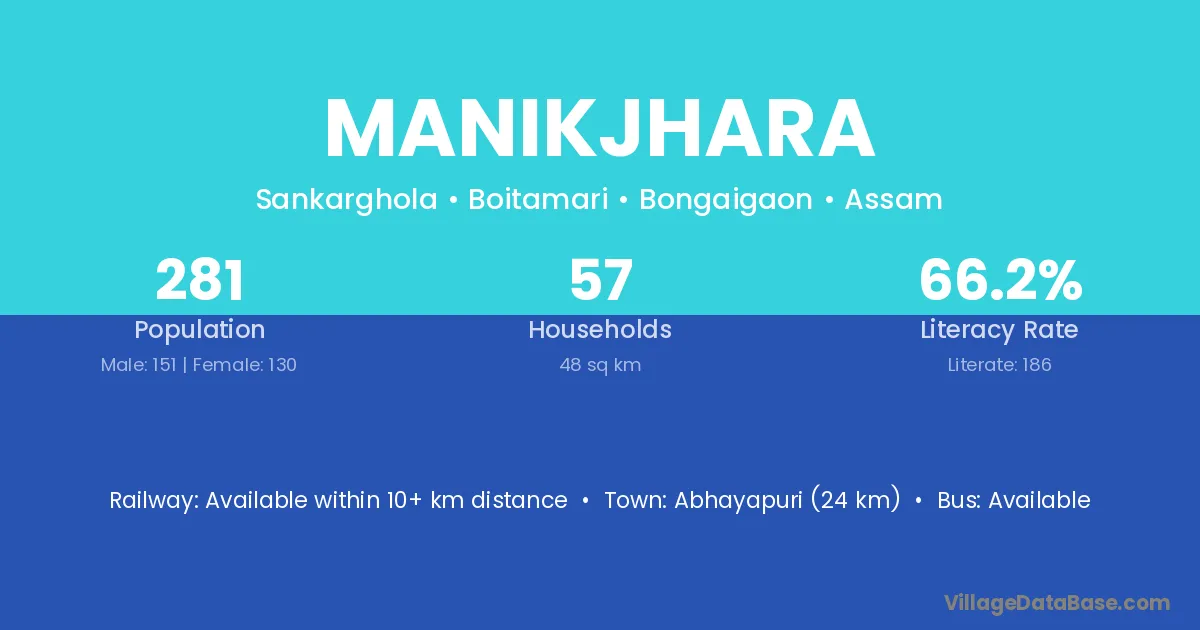 Abhayapuri (24 km) is the nearest town to Manikjhara village for major economic activities and is located approximately 24 km away.