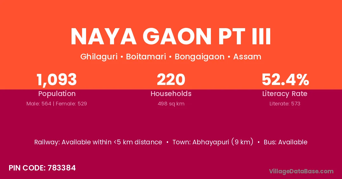 Abhayapuri (9 km) is the nearest town to Naya Gaon Pt Iii village for major economic activities and is located approximately 9 km away.