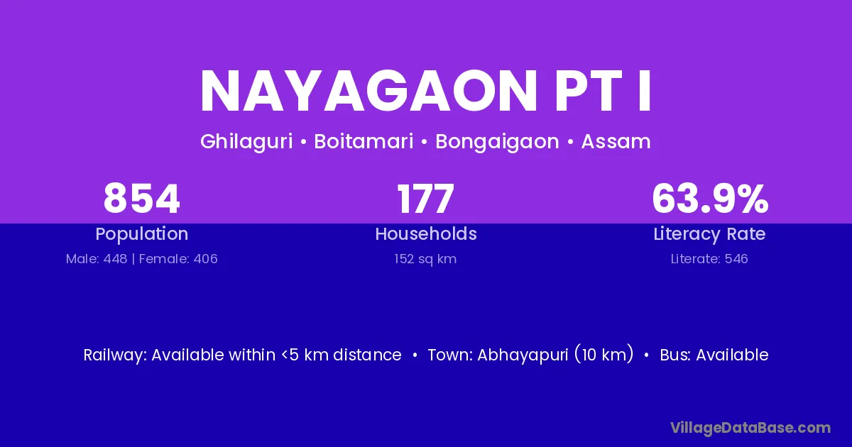 Abhayapuri (10 km) is the nearest town to Nayagaon Pt I village for major economic activities and is located approximately 10 km away.