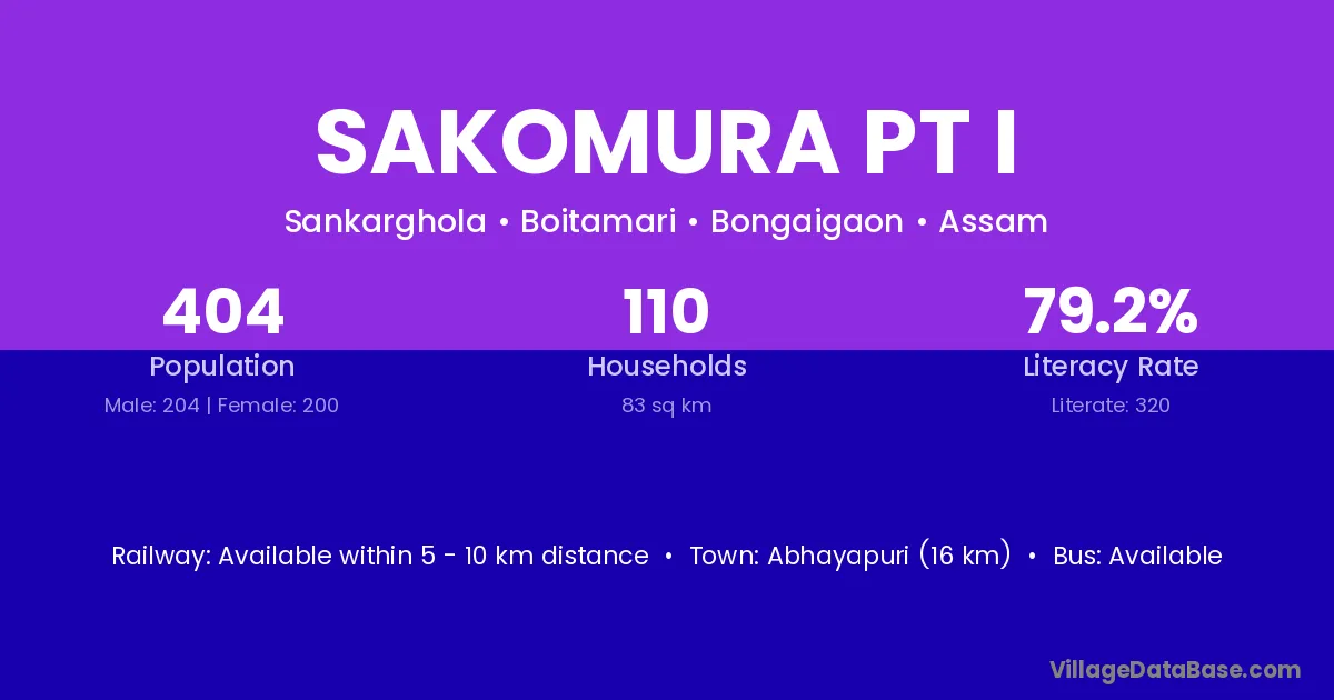 Abhayapuri (16 km) is the nearest town to Sakomura Pt I village for major economic activities and is located approximately 16 km away.