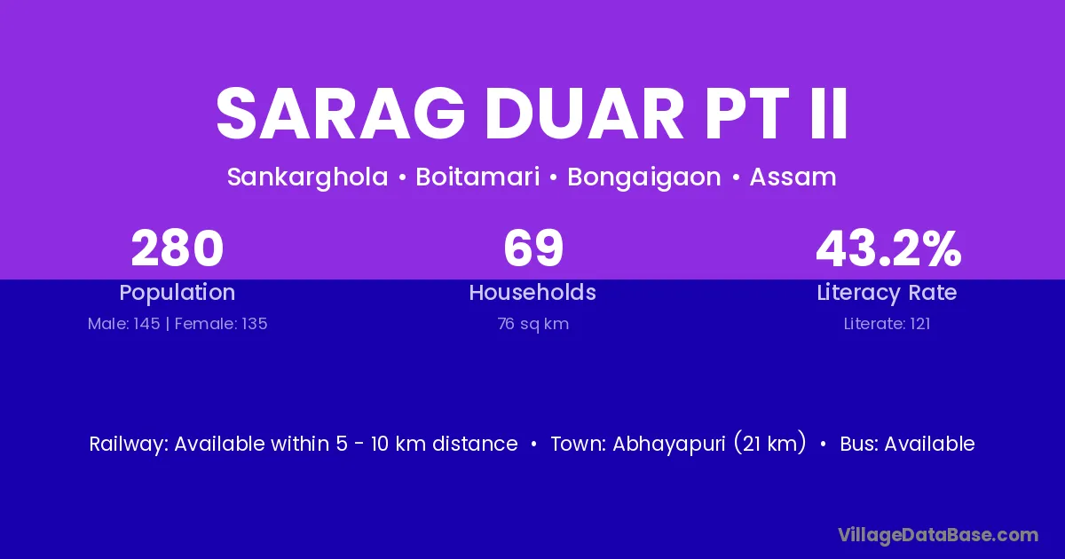 Abhayapuri (21 km) is the nearest town to Sarag Duar Pt Ii village for major economic activities and is located approximately 21 km away.