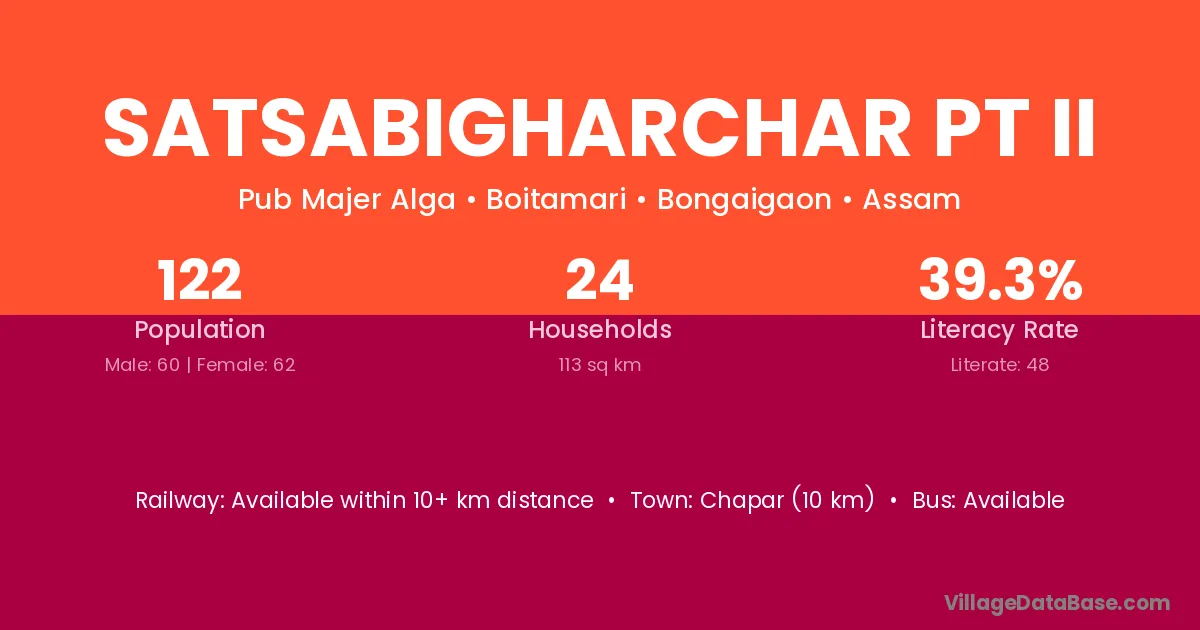 Satsabigharchar Pt Ii village has a total population of 122 people, of which 60 are males and 62 are females.