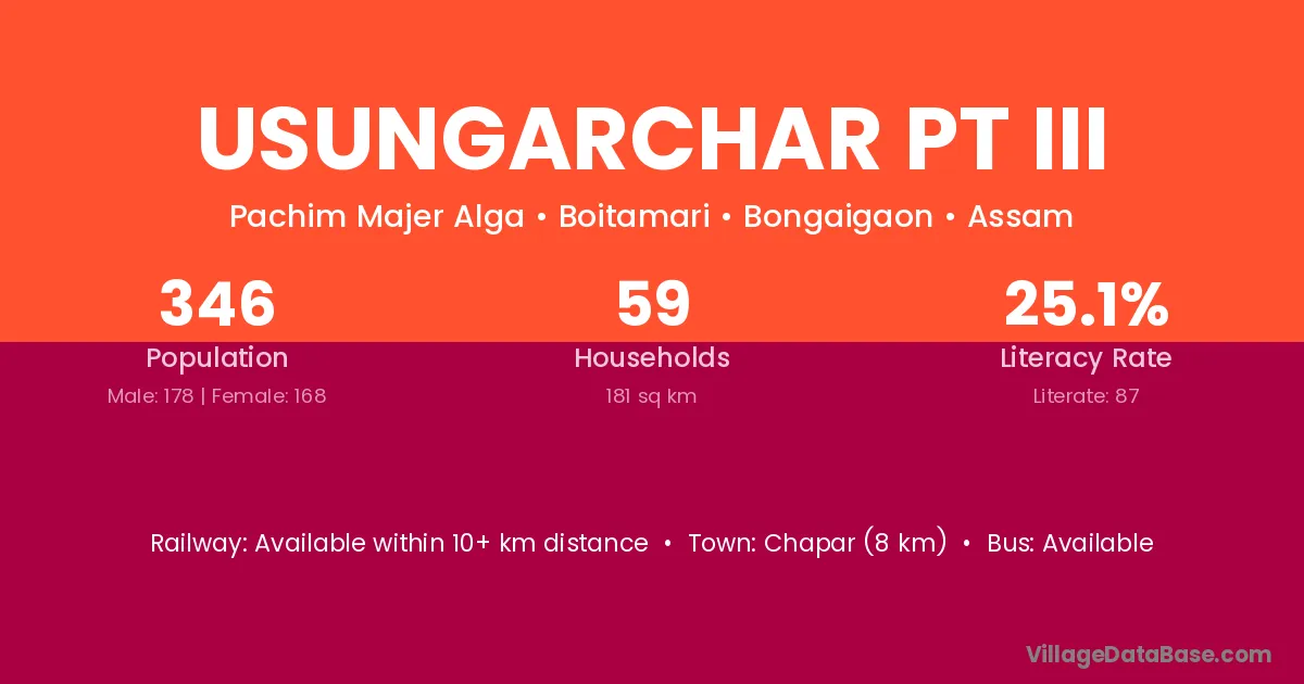 Chapar (8 km) is the nearest town to Usungarchar Pt Iii village for major economic activities and is located approximately 8 km away.