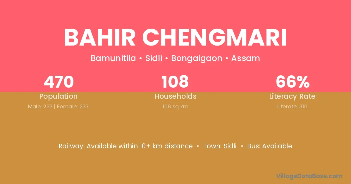 Bahir Chengmari village has a total population of 470 people, of which 237 are males and 233 are females.