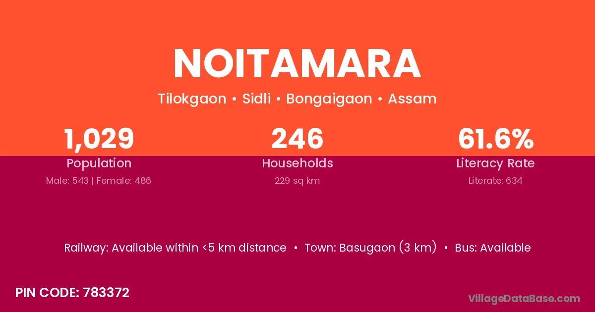 Basugaon (3 km) is the nearest town to Noitamara village for major economic activities and is located approximately 3 km away.