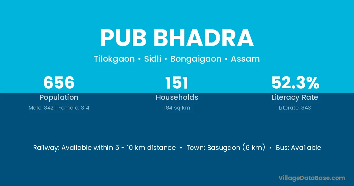 Basugaon (6 km) is the nearest town to Pub Bhadra village for major economic activities and is located approximately 6 km away.