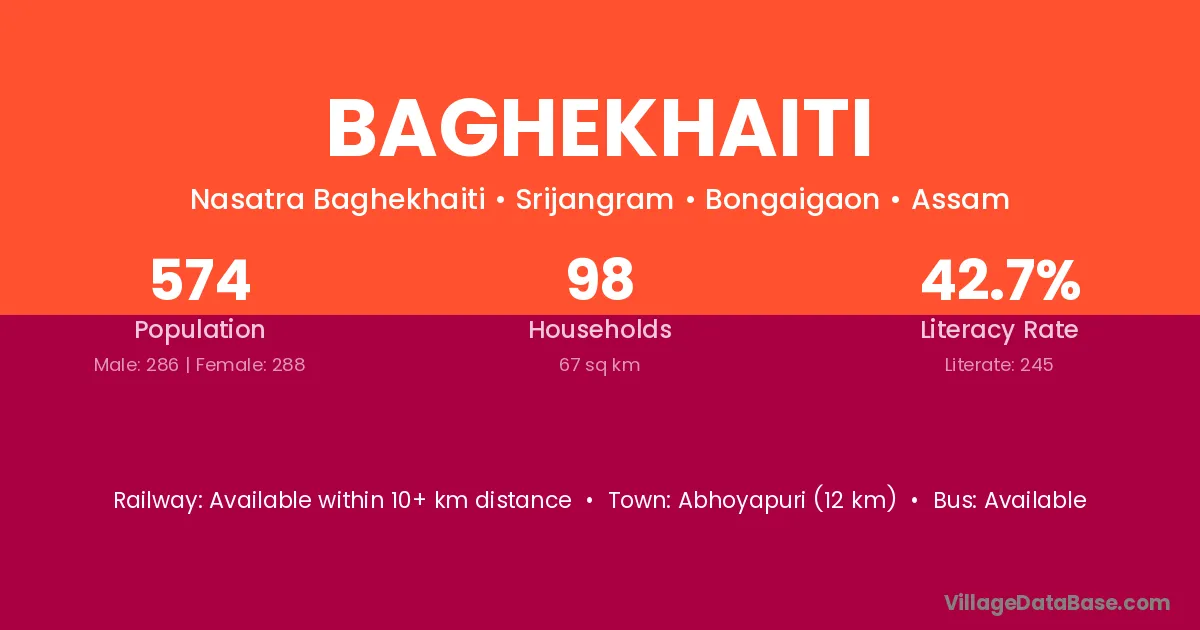 Abhoyapuri (12 km) is the nearest town to Baghekhaiti village for major economic activities and is located approximately 12 km away.