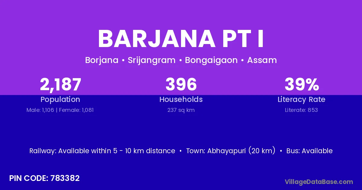 Abhayapuri (20 km) is the nearest town to Barjana Pt I village for major economic activities and is located approximately 20 km away.