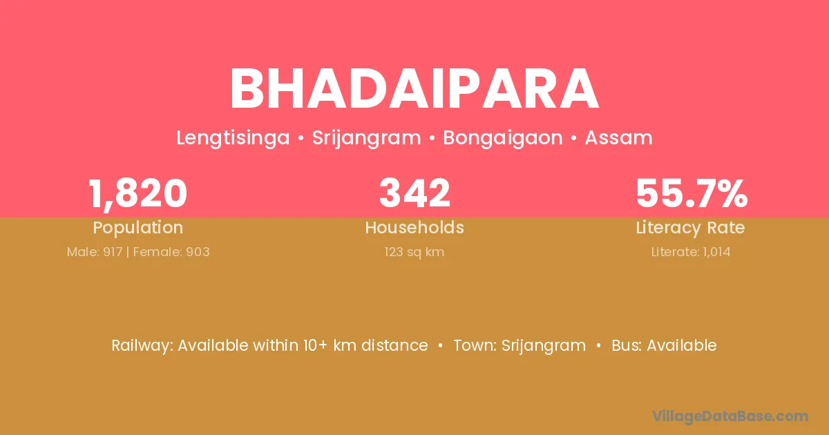 Bhadaipara village has a total population of 1,820 people, of which 917 are males and 903 are females.