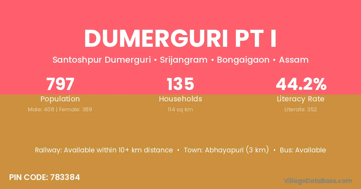 Abhayapuri (3 km) is the nearest town to Dumerguri Pt I village for major economic activities and is located approximately 3 km away.