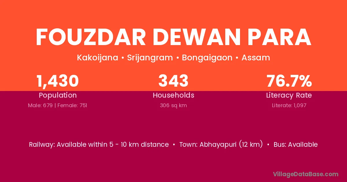Abhayapuri (12 km) is the nearest town to Fouzdar Dewan Para village for major economic activities and is located approximately 12 km away.