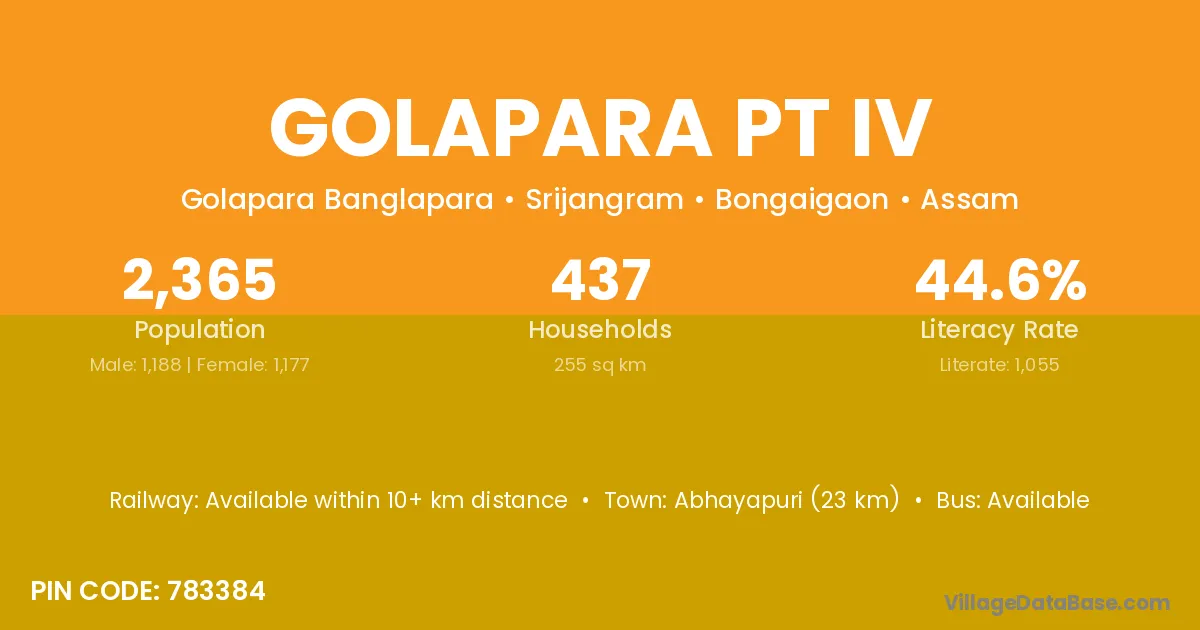 Abhayapuri (23 km) is the nearest town to Golapara Pt Iv village for major economic activities and is located approximately 23 km away.
