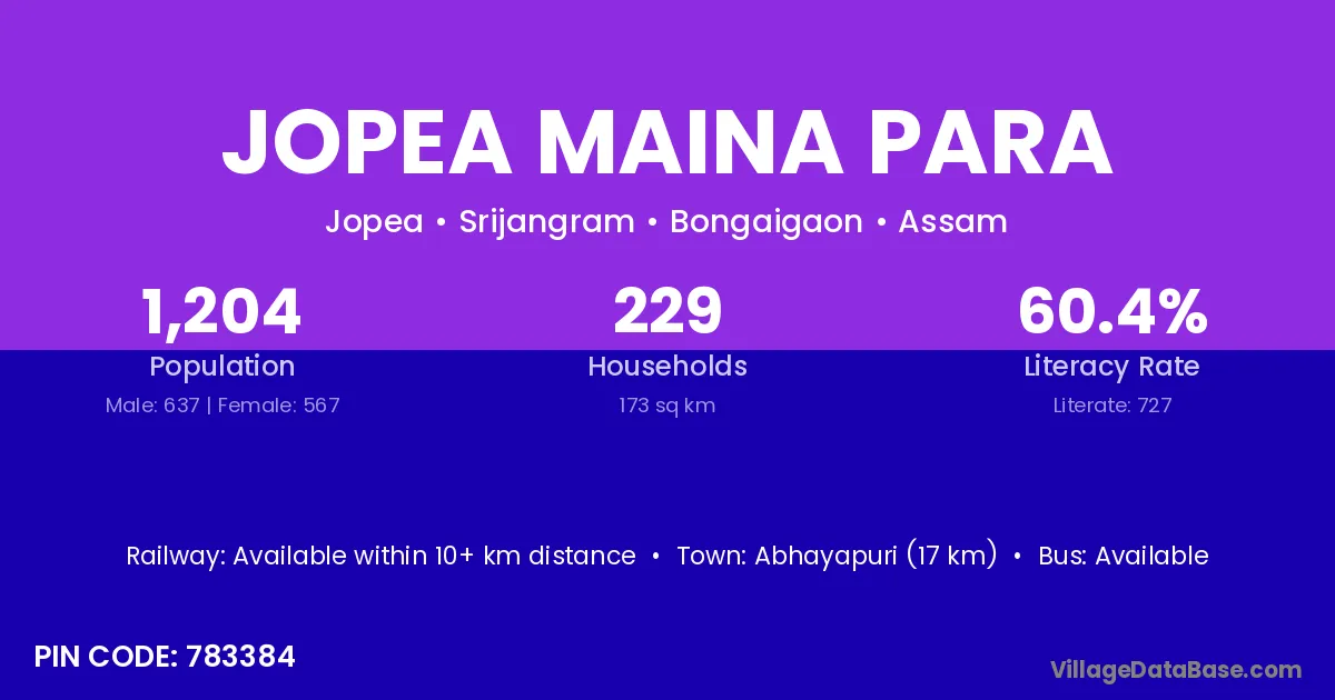 Abhayapuri (17 km) is the nearest town to Jopea Maina Para village for major economic activities and is located approximately 17 km away.